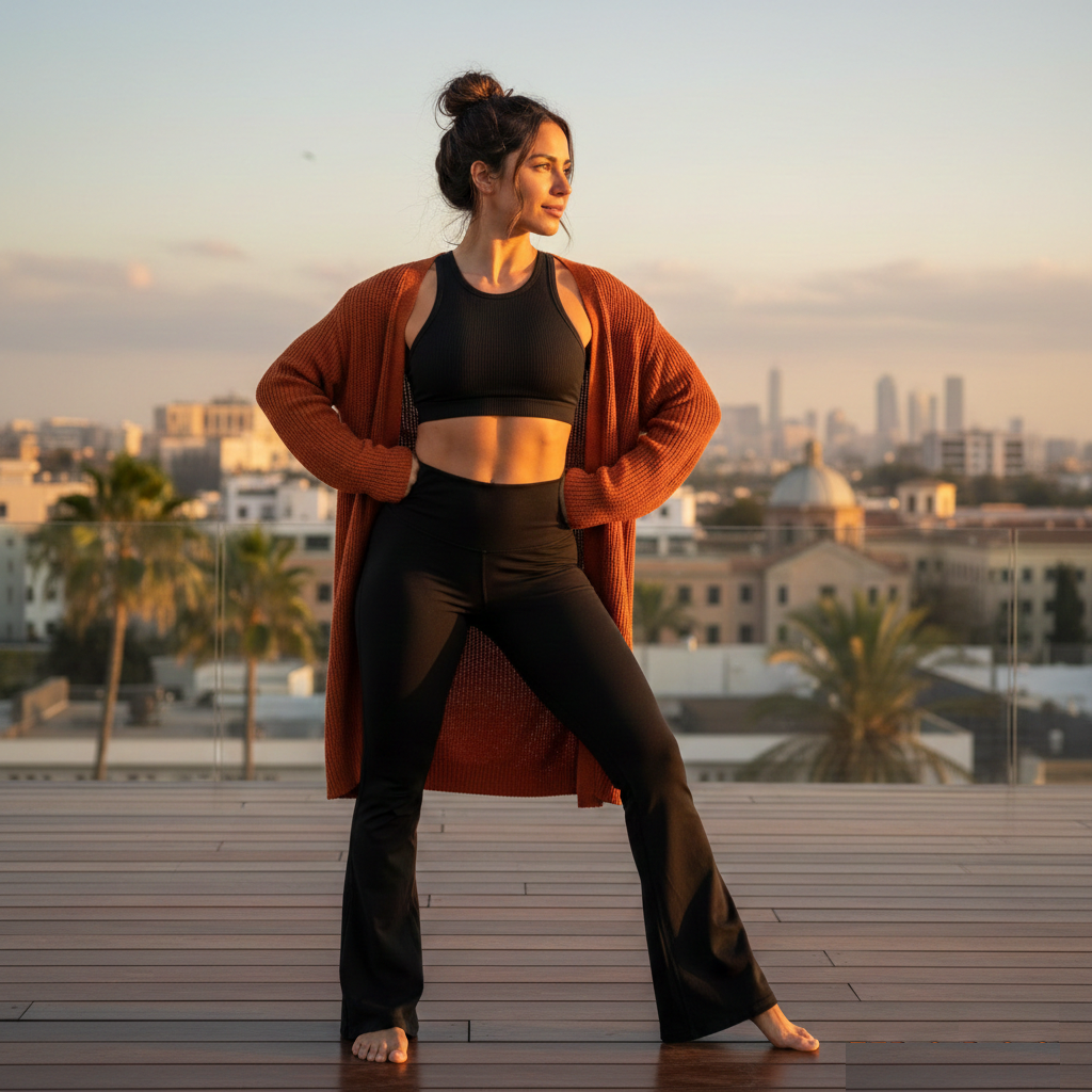 Shoes matter a lot with flares though. Since the pants are longer, I usually go for platform sneakers, chunky trainers, or even platform Uggs in winter. They keep the hem from dragging on the ground and add to that long leg illusion. In summer, flared yoga pants with slides or platform sandals are super chill and effortless.